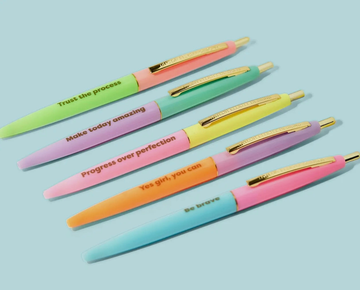 Our medium ballpoint pen set features five vibrant colors, various compliments & affirmations, accented with metallic gold foil details.