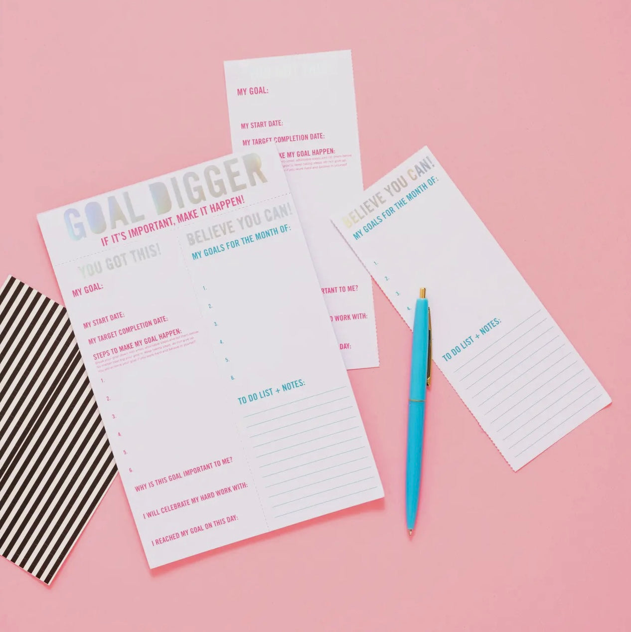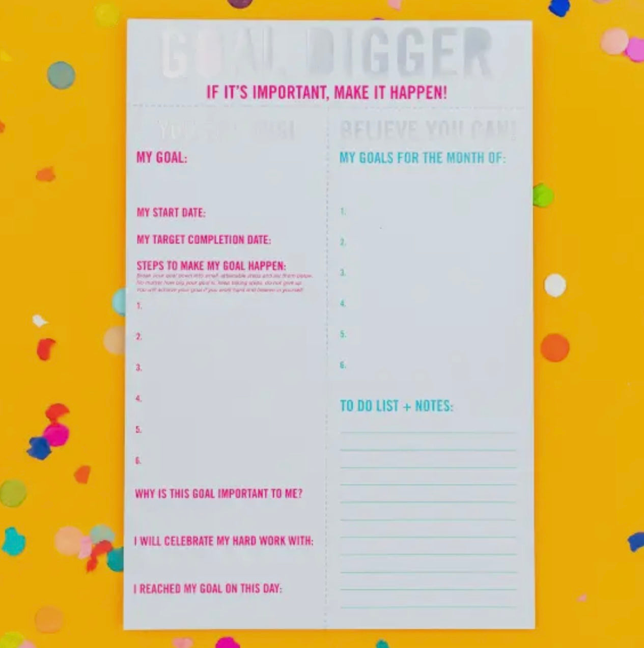Set goals with our Goal Digger Goal Setting Notepad! These notepads are intended to help anyone achieve the goals they set for themselves. Each side of the page has unique goal-oriented sections to fill out. Once complete, you can tear the sides apart along the perforations and tape those goals wherever is best using the included stickers.Β