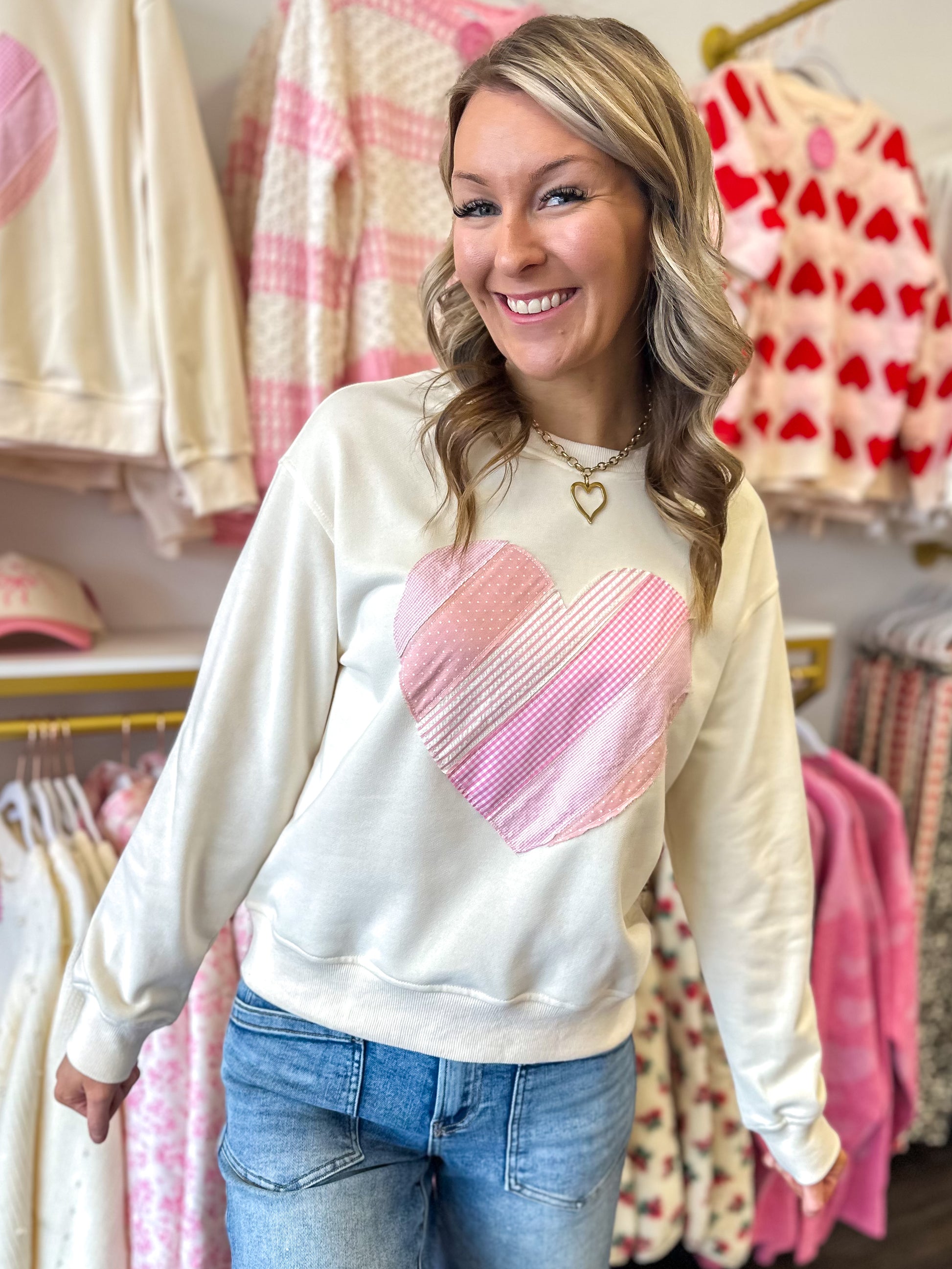- Cream Colored Sweatshirt with Heart Patchwork Detailing