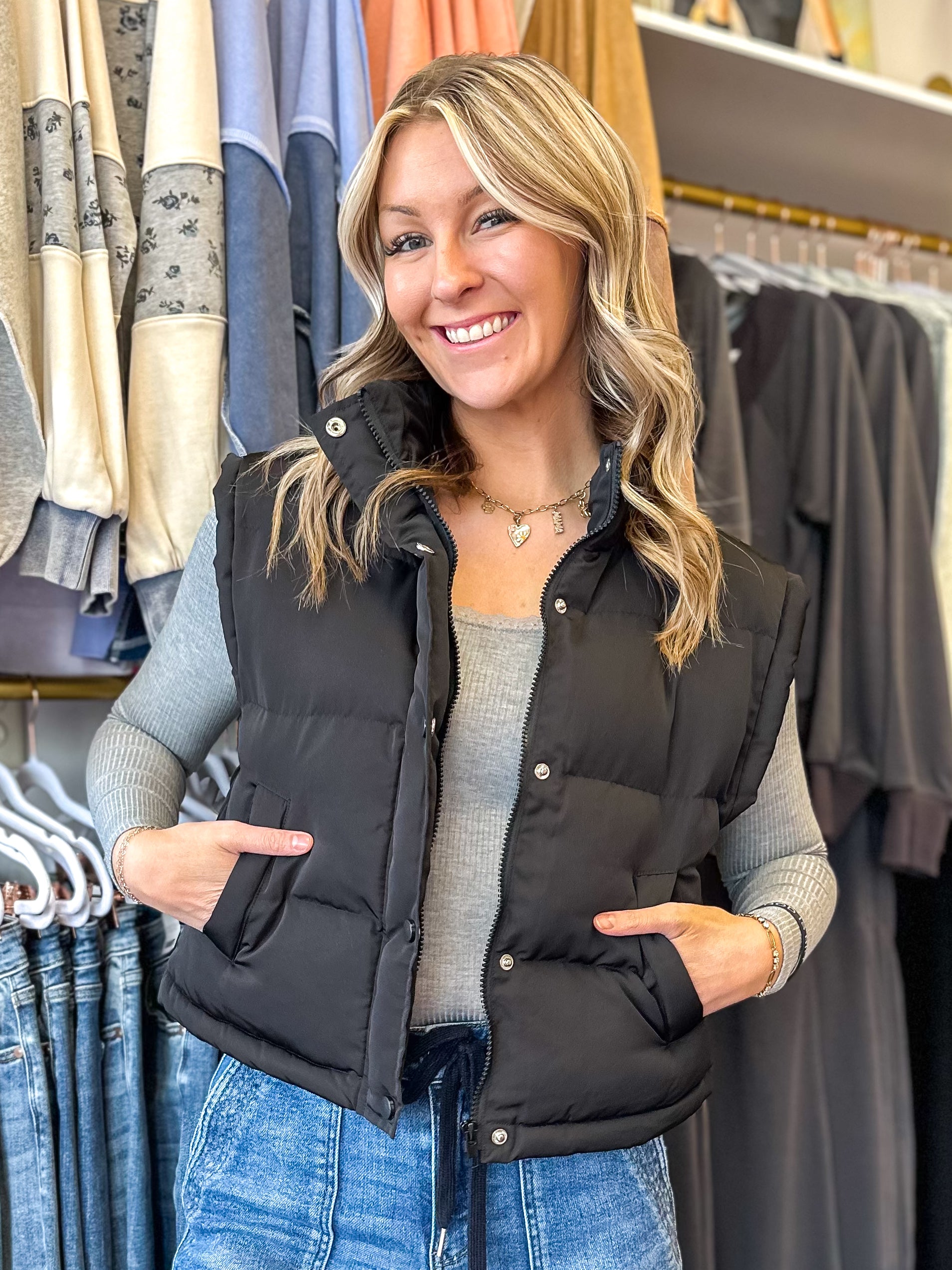 Our Mallory Mock Neck Puffer Vest is an essential for staying warm & oh so cute all season long!