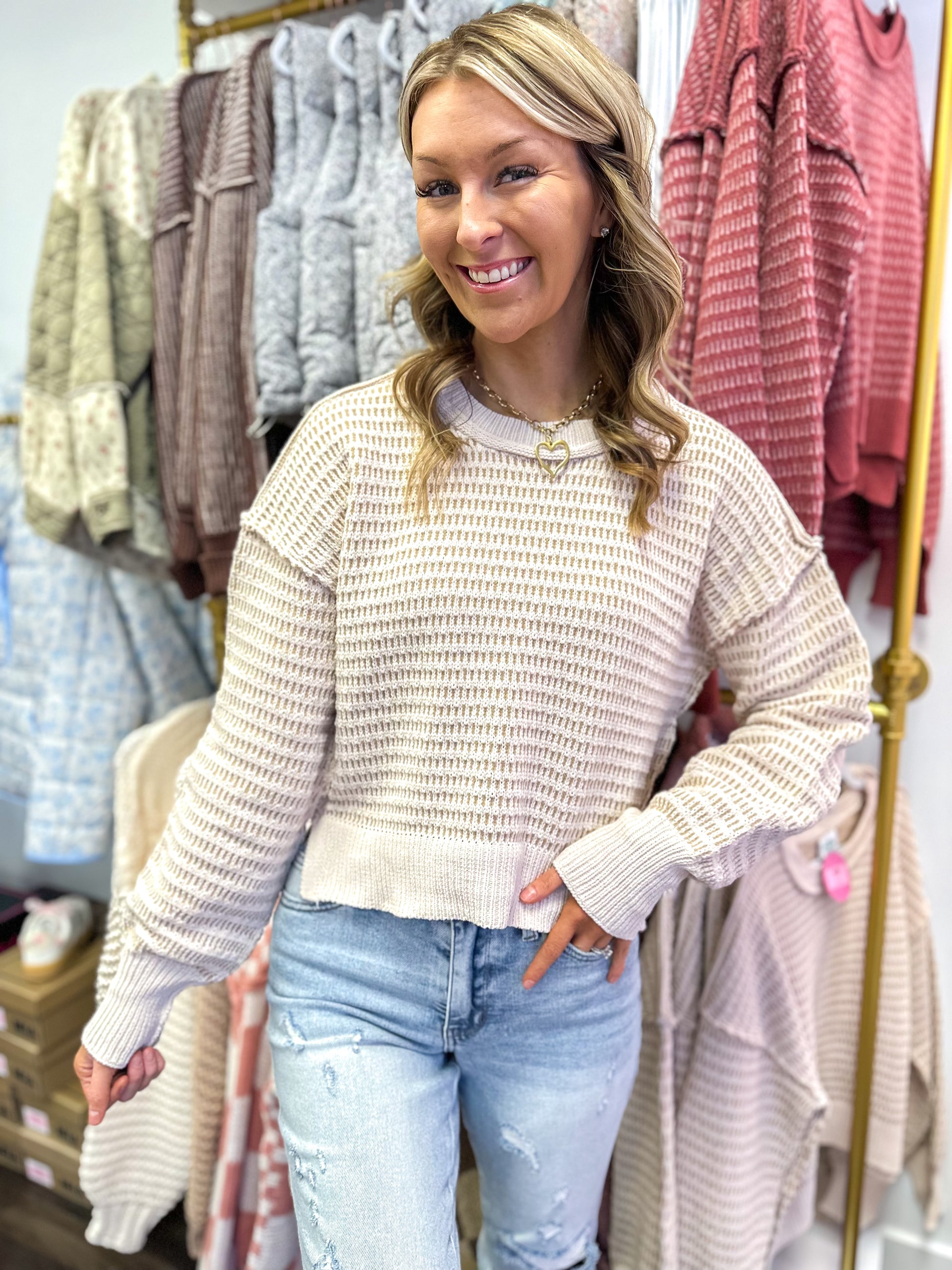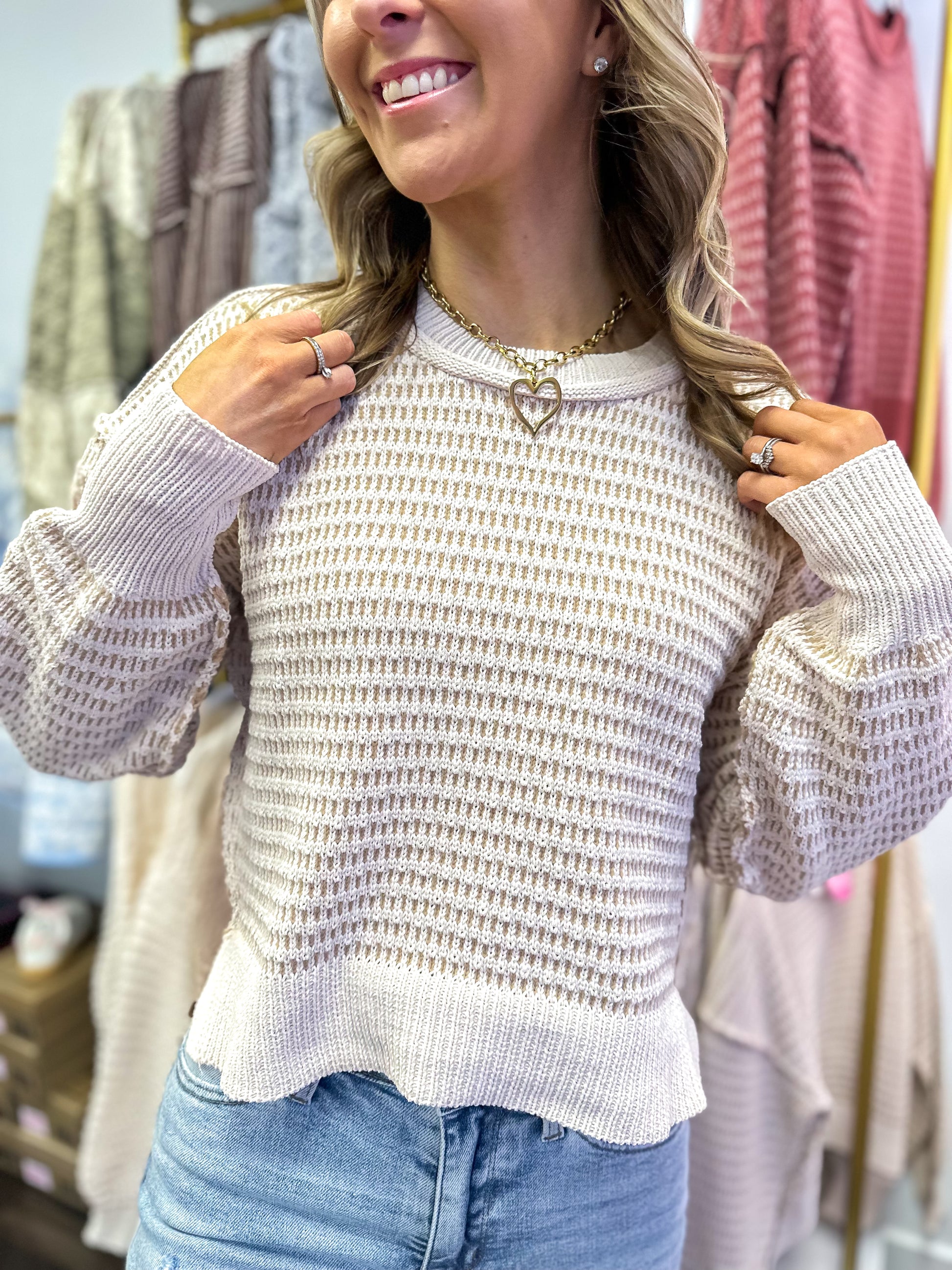 - Two Tone Textured Knit Casual Sweater Top