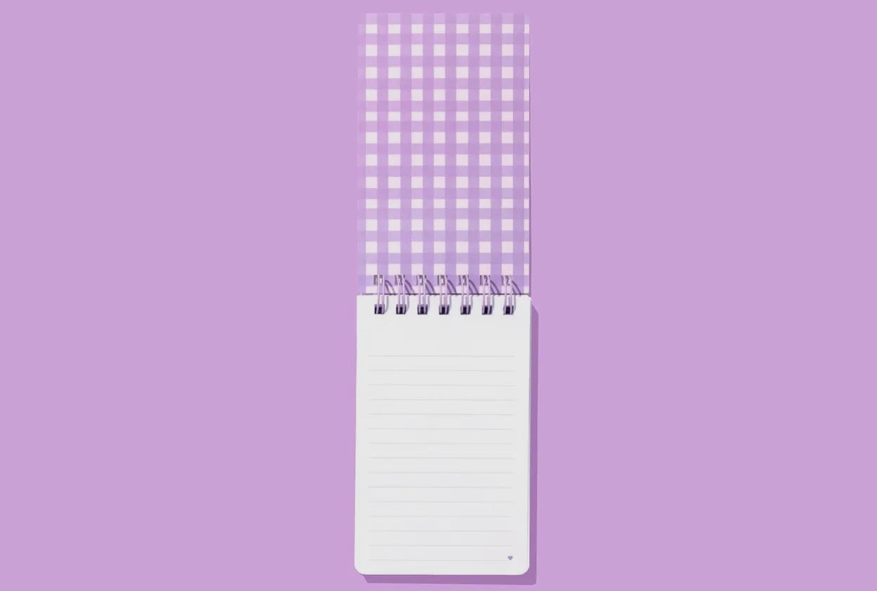 This notebook has wildflowers on the durable, hard cover. Each page is lined & has perforations for easy removal. The binding is purple & the inside cover is a purple gingham print.