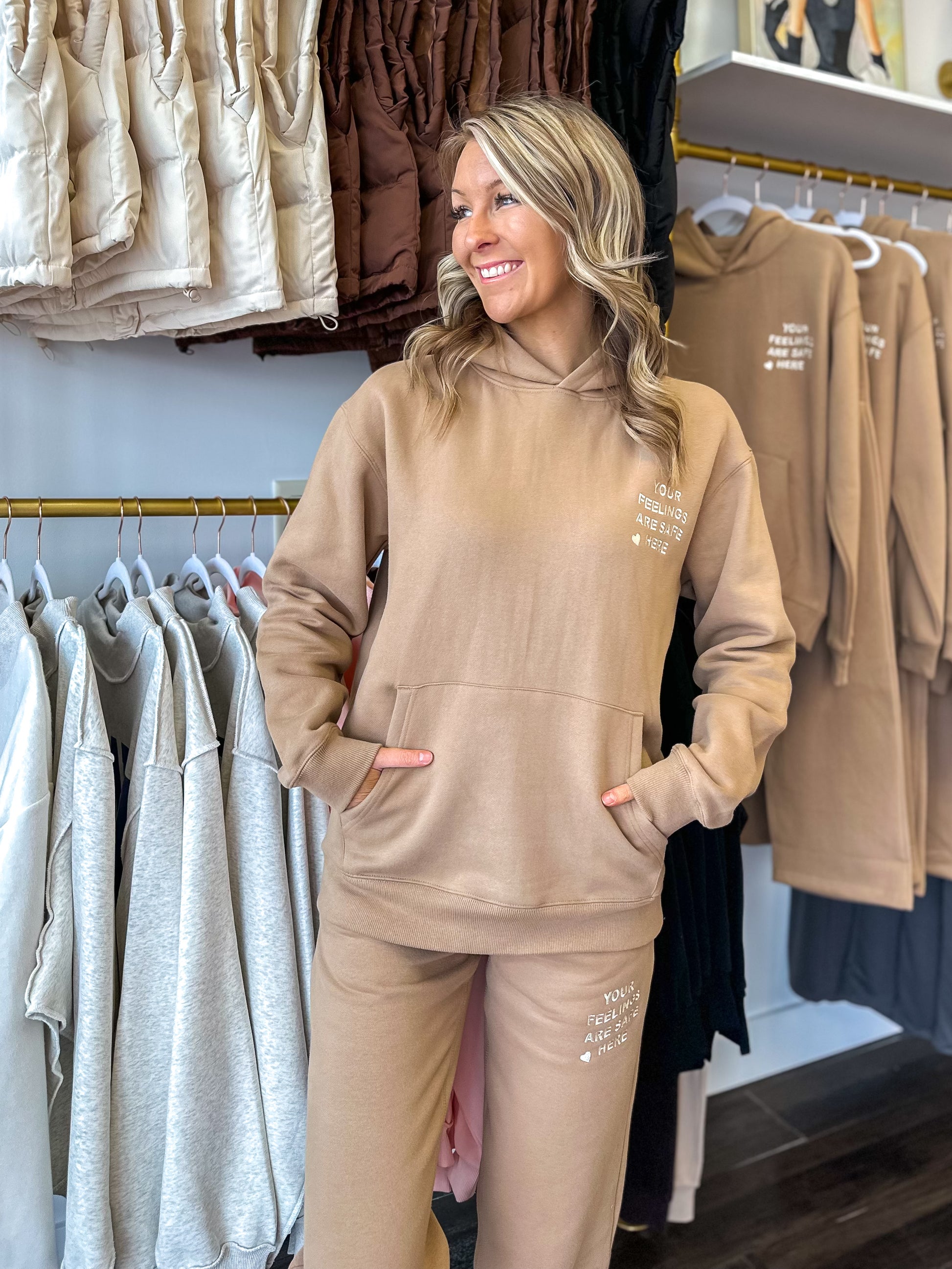 A soft reminder wrapped in comfort. The Your Feelings Are Safe Here Hoodie features warm brown tones and an embroidered quote that reads “Your Feelings Are Safe Here.” Cozy, grounding, and perfect for slow days or moments of reflection. Pairs perfectly with the Your Feelings Are Safe Here Sweatpants.